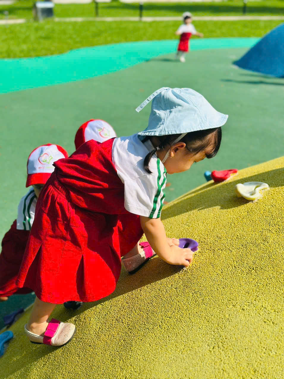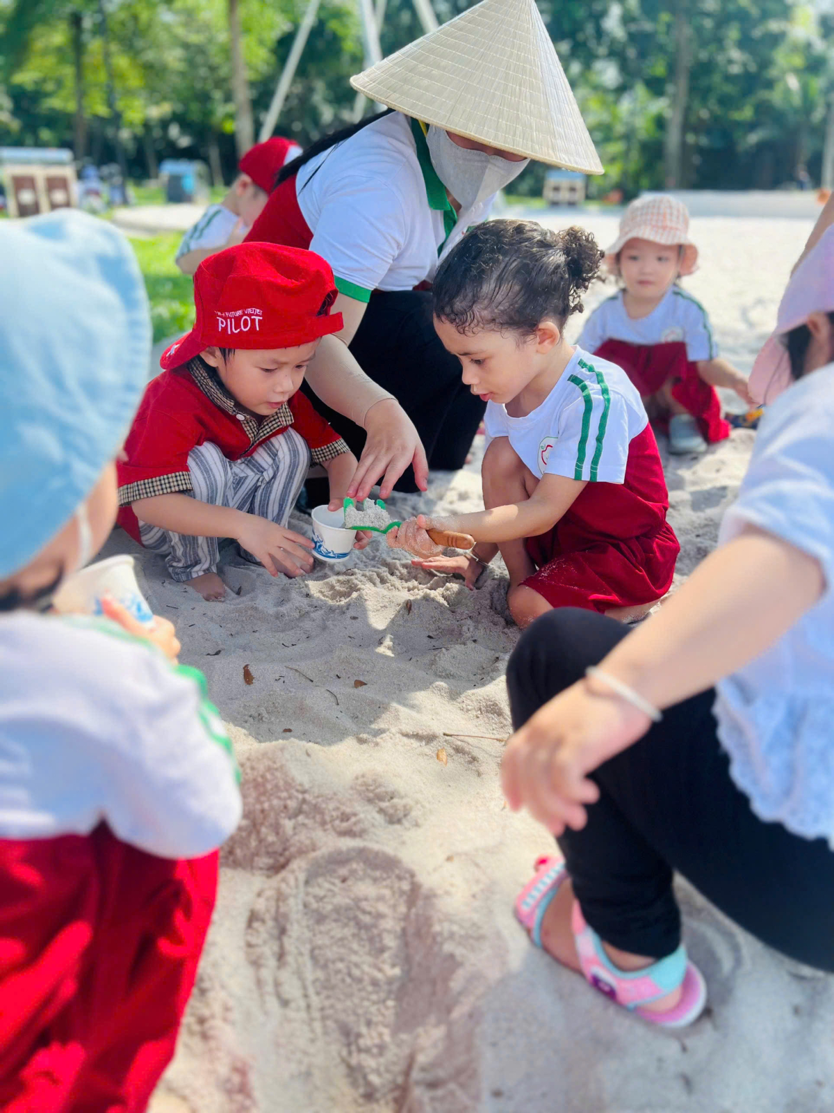 Cô giáo hướng dẫn bé ăn uống, giữ gìn vệ sinh và tham gia các hoạt động team building nhỏ.